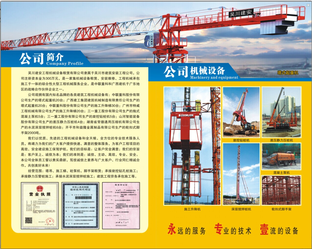 吳川建安工程機(jī)械設(shè)備租賃有限公司隸屬于吳川市建筑安裝工程公司,公司注冊(cè)資本金為300萬(wàn)元,是一家集機(jī)械設(shè)備租賃、安裝維修、工程機(jī)械施工承包于一體的綜合性大型工程機(jī)械服務(wù)企業(yè)。是中聯(lián)重科和廣西建機(jī)于廣東地區(qū)的戰(zhàn)略合作伙伴企業(yè)之一。
