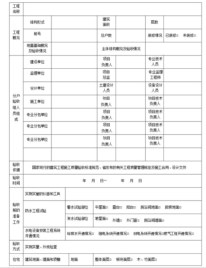 1、建設(shè)單位作為住宅工程質(zhì)量分戶驗(yàn)收的第一責(zé)任人,應(yīng)根據(jù)工程 的實(shí)際情況填寫(xiě)《住宅工程質(zhì)量分戶驗(yàn)收方案》; |