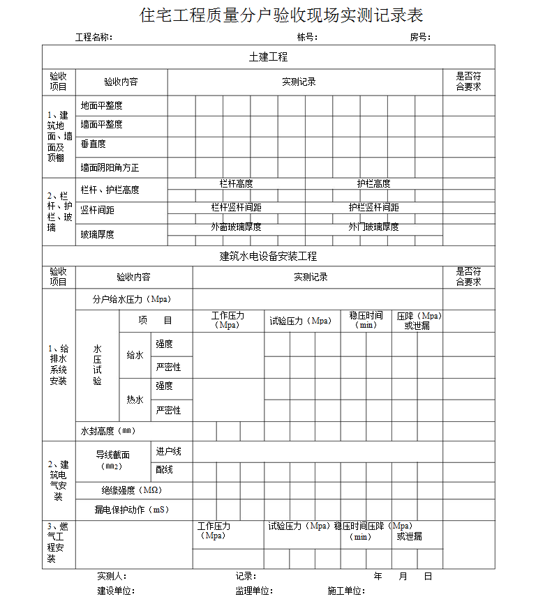 住宅工程質(zhì)量分戶驗收現(xiàn)場實測記錄表